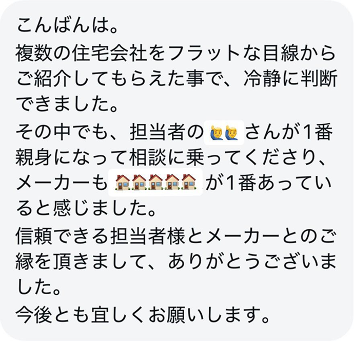 理想のおうちを建てる上で最も重要なのが住宅会社の「担当者」です。弊社は住宅会社のご紹介だけでなく「評価の高い担当者」をご紹介が可能です。